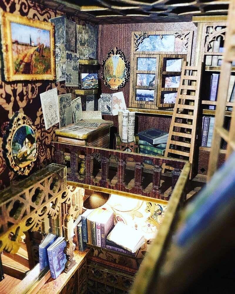 Le design classique de ce Book Nook comprend un étage supérieur et inférieur, avec un escalier d'angle qui crée une fluidité ascendante, renforçant la sensation d'espace. Le design ouvert permet à la lumière d'illuminer les détails complexes à l'intérieur. Imaginez-vous près d'un foyer confortable, entouré d'étagères remplies de livres anciens et accompagné d'un chien fidèle. La scène est magnifiquement complétée par des lampes murales ornées, des peintures à l'huile encadrées et des bougies vintage, créant une atmosphère chaleureuse et accueillante.