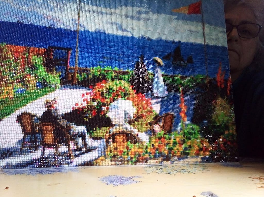 J ai ete enchantée de réaliser cette '' oeuvre' ' j y passe paisiblement mes heures de détente et maintenant je commence un autre tableau !!!