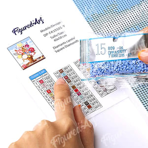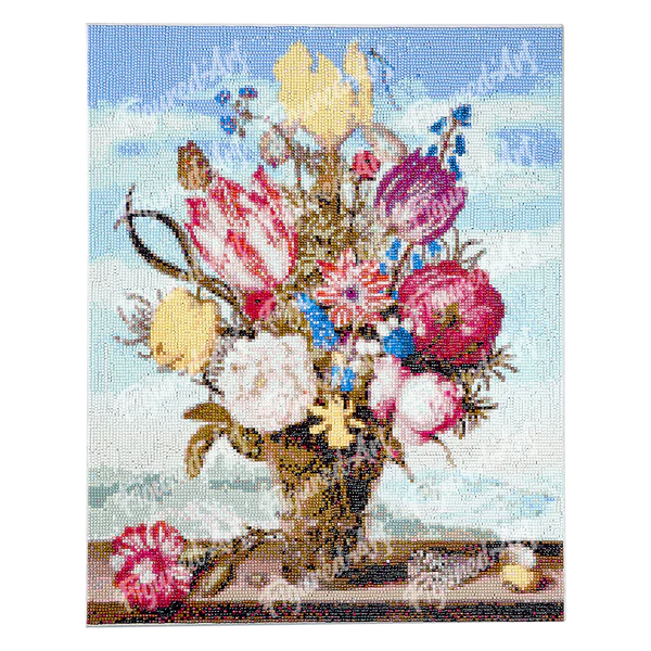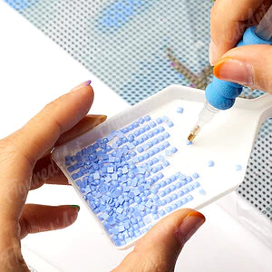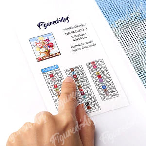 1 toile adhésive de qualité supérieure, numérotée en fonction du motif à réaliser et déjà tendue sur châssis. Une plaque en bois au dos de la toile permet une parfaite rigidité pour appliquer les diamants.