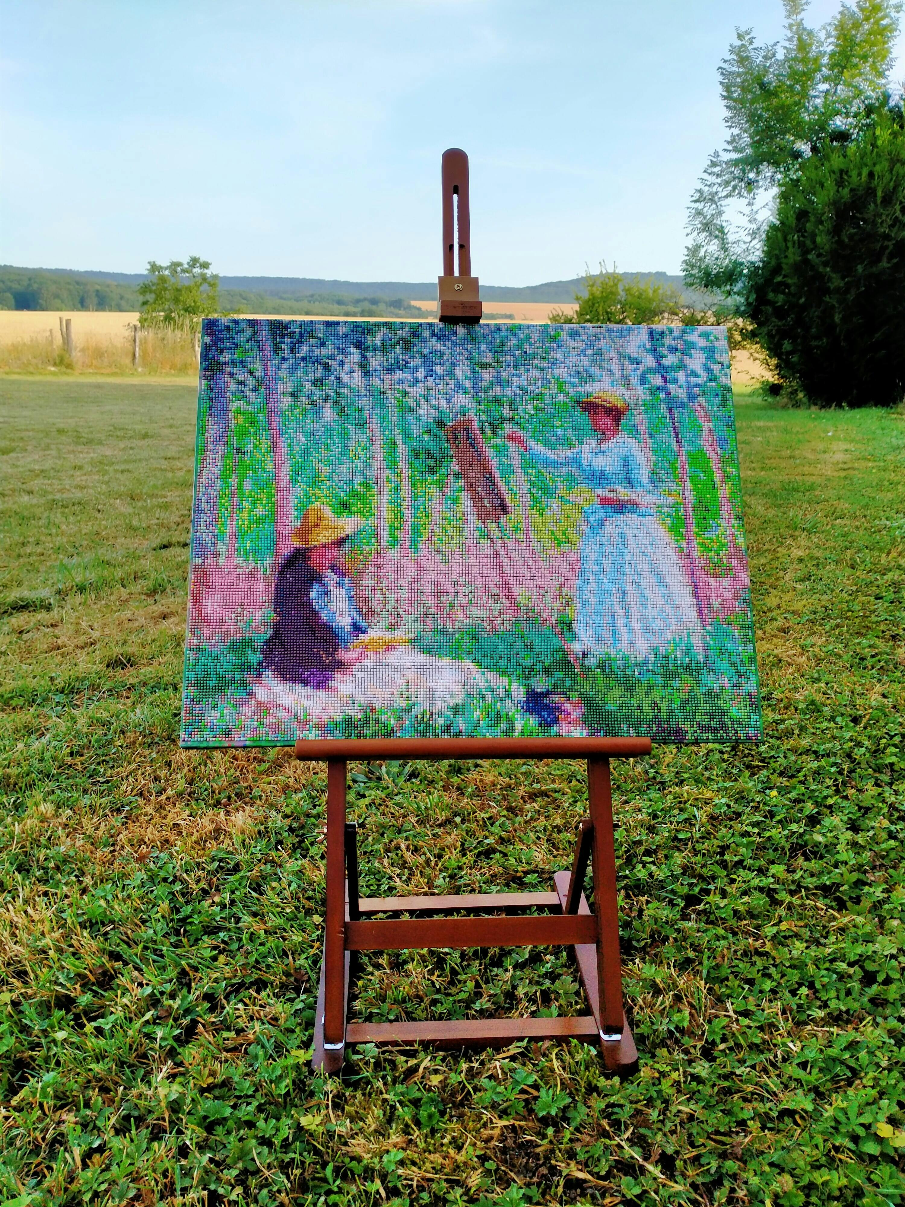 1 toile adhésive de qualité supérieure, numérotée en fonction du motif à réaliser et déjà tendue sur châssis. Une plaque en bois au dos de la toile permet une parfaite rigidité pour appliquer les diamants.