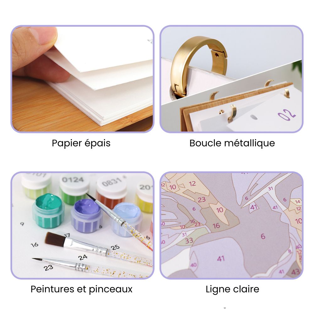 Ce calendrier célèbre le charme des couleurs de la nature. Chaque feuille présente une illustration florale détaillée, prête à éclore sous votre pinceau avec les peintures acryliques incluses. Des délicates fleurs de printemps aux bouquets d'été vibrants et aux tons chauds de l'automne, vous créerez un voyage fleuri à travers les saisons.