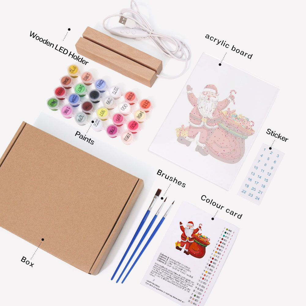 Ce kit festif de Peinture par numéros au format 15x20cm avec base d'exposition en bois avec lumière LED contient tout ce dont vous avez besoin pour créer votre chef-d'œuvre des fêtes :
