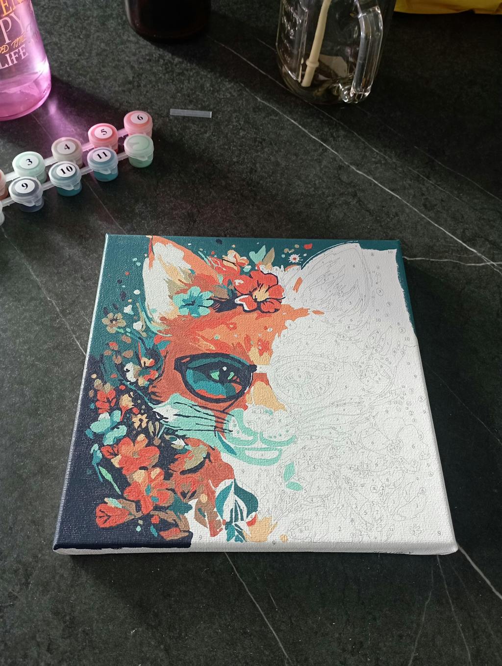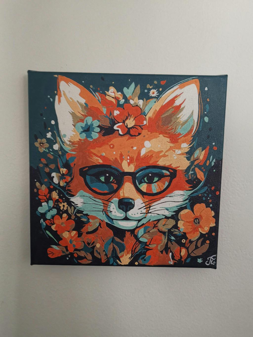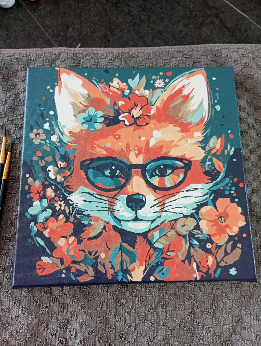 Modèle : Mini Peinture par Numéros 20x20cm avec cadre Renard Fantaisie et Fleurs