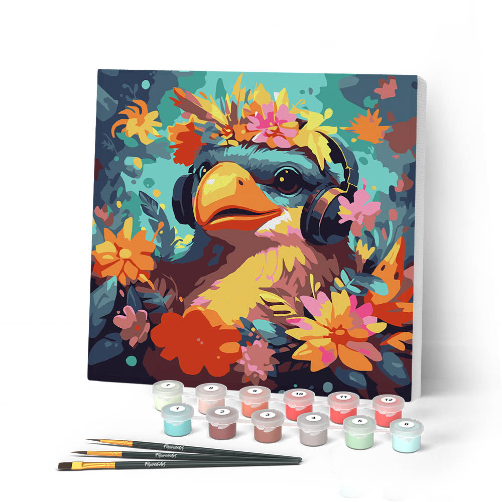 Modèle : Mini Peinture par Numéros 20x20cm avec cadre Oiseau fantaisie et des fleurs