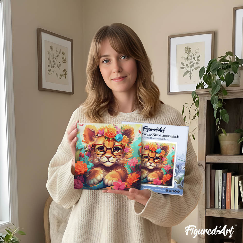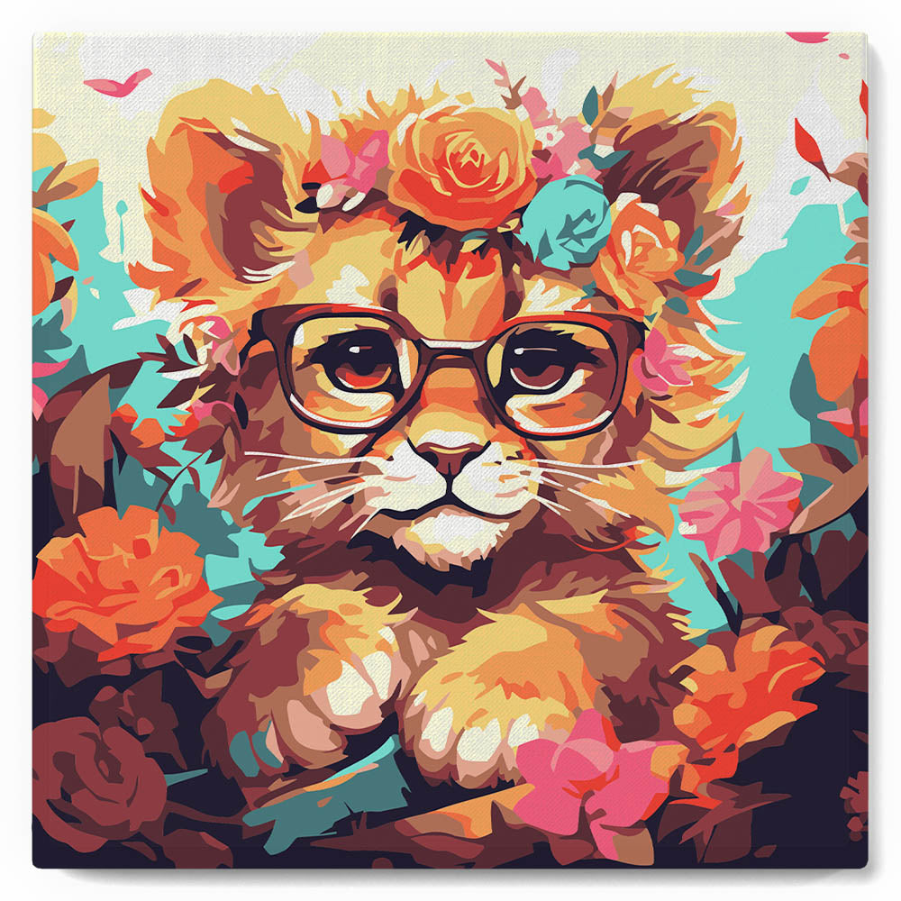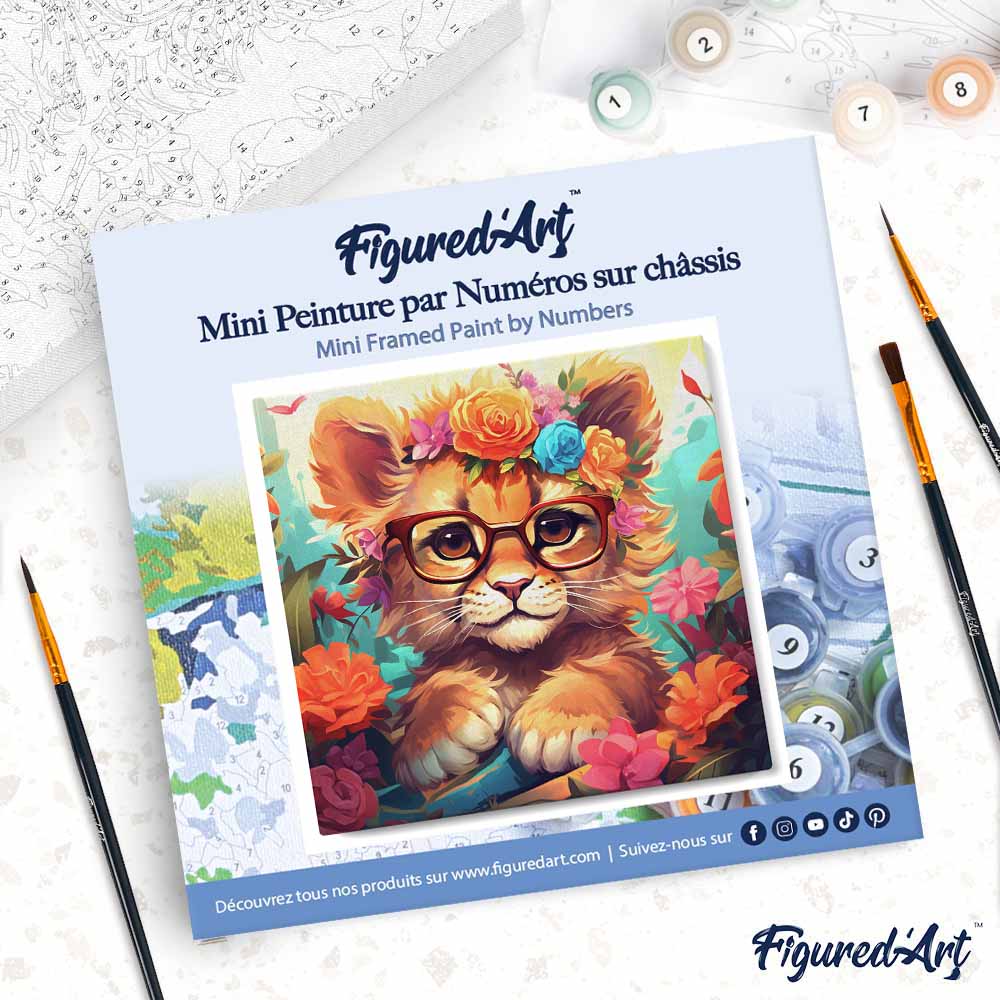 Modèle : Mini Peinture par Numéros 20x20cm avec cadre Lionceau fantaisie et fleurs