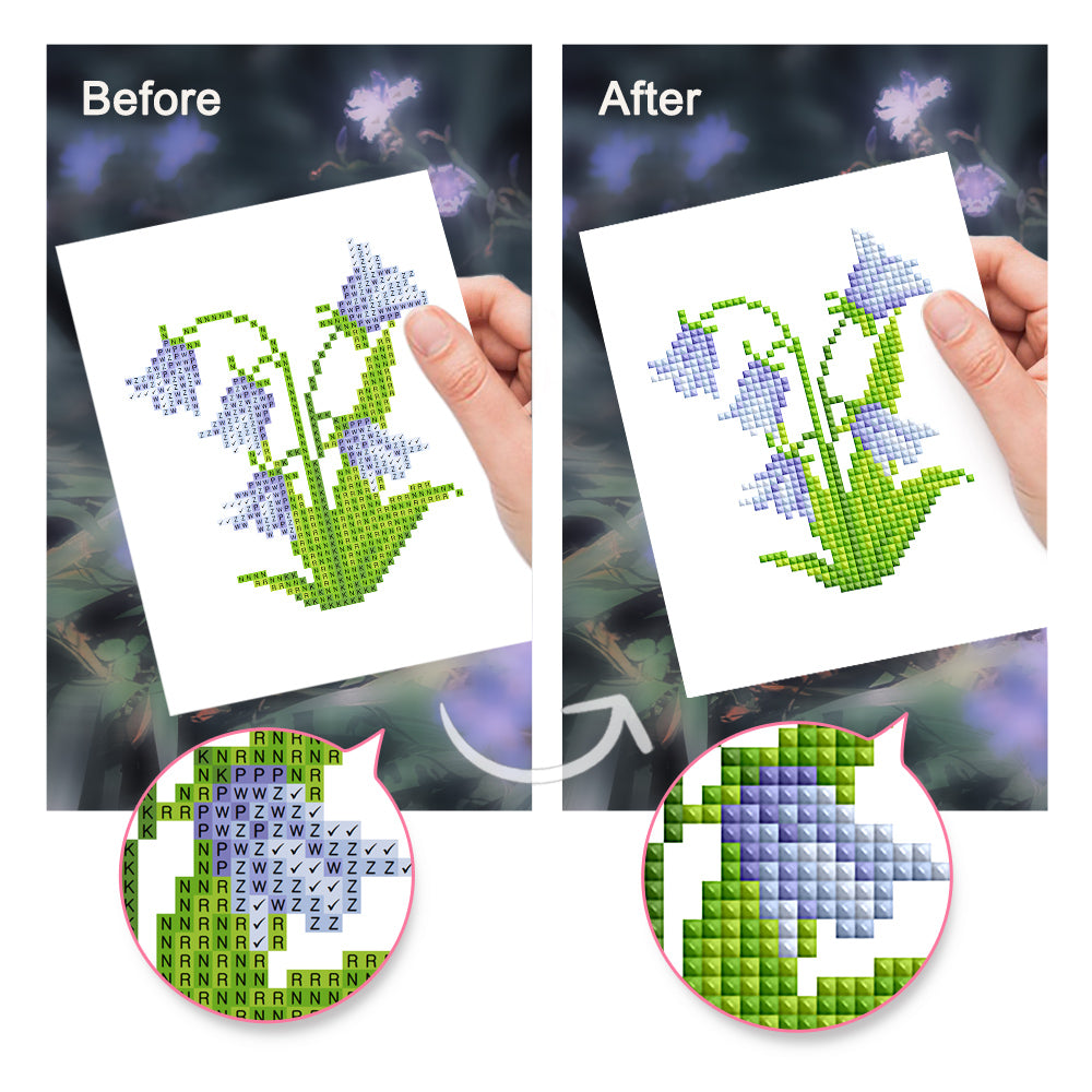 3) Placez les diamants en fonction des numéros indiqués sur la toile à l'aide du stylet et de la pince en vous basant sur la grille de correspondance.
