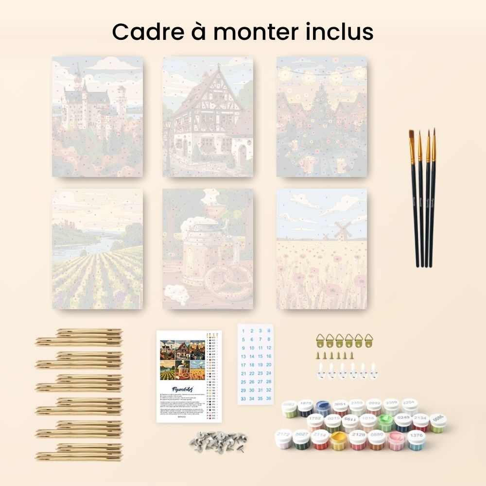 Le set "Bonjour Allemagne" comprend six modèles de peinture par numéros inspirés des paysages riches et des symboles emblématiques de ce pays. Des collines verdoyantes des Alpes bavaroises aux châteaux historiques, en passant par les motifs traditionnels comme le bretzel et la chope de bière, chaque toile capture l'esprit et le patrimoine de la culture allemande avec une touche artistique contemporaine. Parfait pour les amateurs de peinture en quête d'évasion et de créativité.