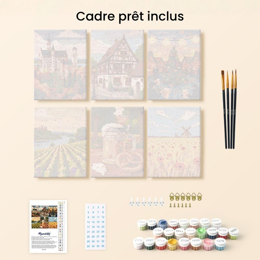Le set "Bonjour Allemagne" comprend six modèles de peinture par numéros inspirés des paysages riches et des symboles emblématiques de ce pays. Des collines verdoyantes des Alpes bavaroises aux châteaux historiques, en passant par les motifs traditionnels comme le bretzel et la chope de bière, chaque toile capture l'esprit et le patrimoine de la culture allemande avec une touche artistique contemporaine. Parfait pour les amateurs de le peinture en quête d'évasion et de créativité.