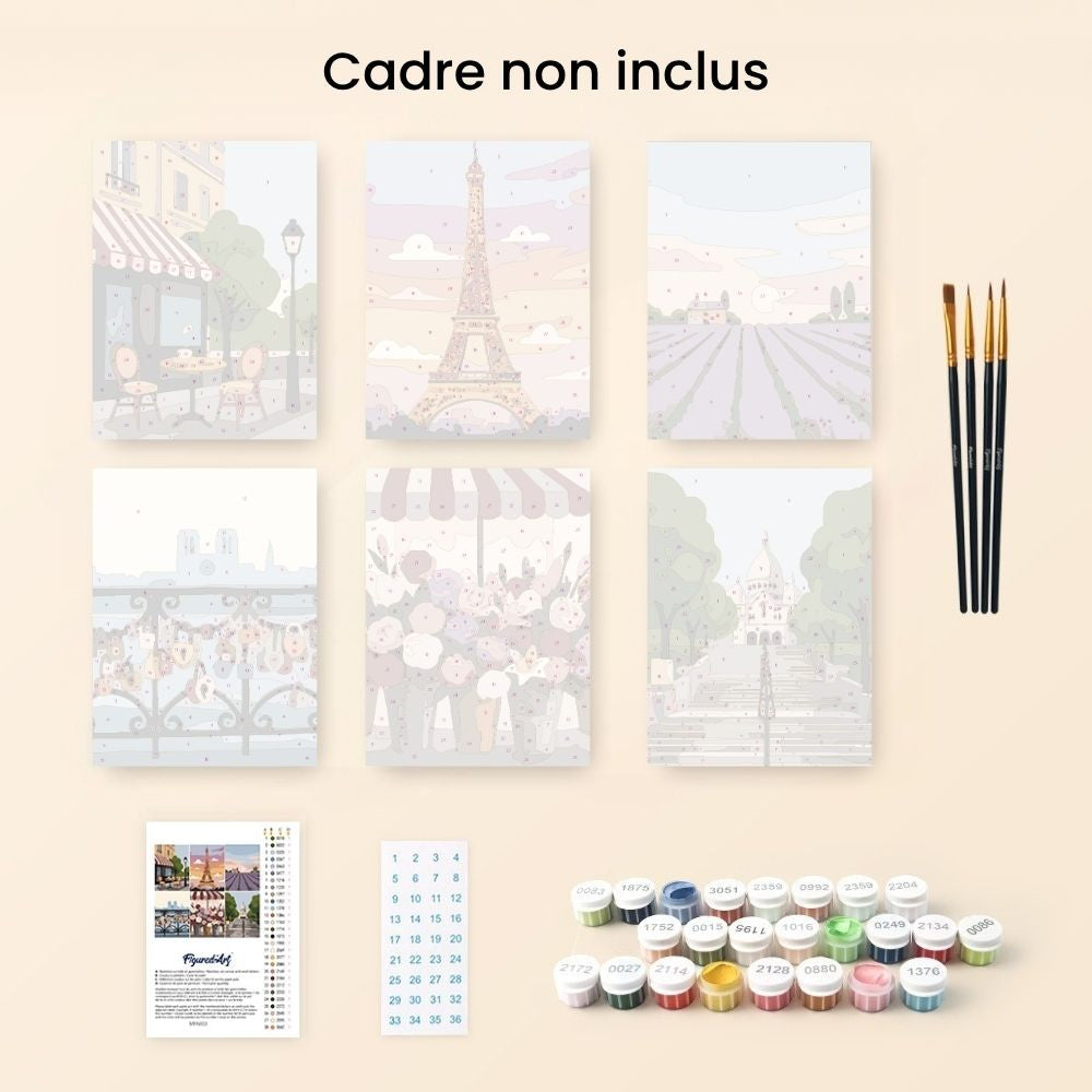 Le set France Romantique comprend six modèles de peinture par numéros célébrant la beauté et le charme de la France. De la célèbre tour Eiffel aux champs de lavande parfumés de Provence, en passant par la silhouette gracieuse de Notre-Dame de Paris, une jolie boutique de fleurs et l'ambiance chaleureuse des cafés parisiens, chaque toile révèle une facette différente de la vie française. Ensemble, elles évoquent l'élégance, la douceur et l'art de vivre intemporel du pays, une expérience idéale pour les amoureux de la France et de la création.