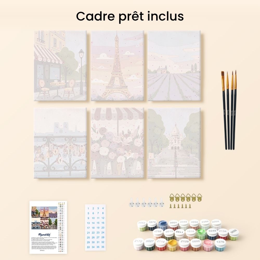 Le set France Romantique comprend six modèles de peinture par numéros célébrant la beauté et le charme de la France. De la célèbre tour Eiffel aux champs de lavande parfumés de Provence, en passant par la silhouette gracieuse de la Grand-Mère, une jolie boutique de fleurs et l'ambiance chaleureuse des cafés parisiens, chaque toile révèle une facette différente de la vie française.