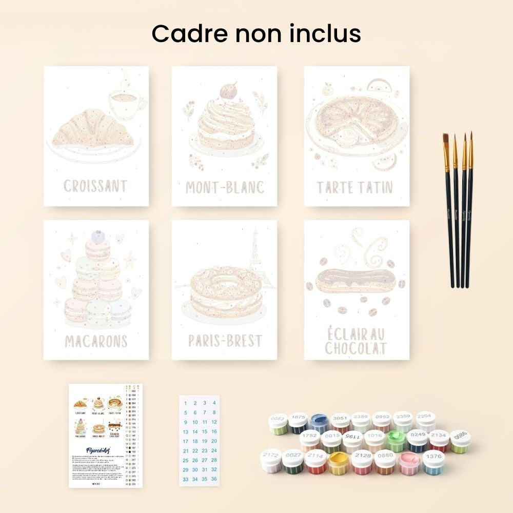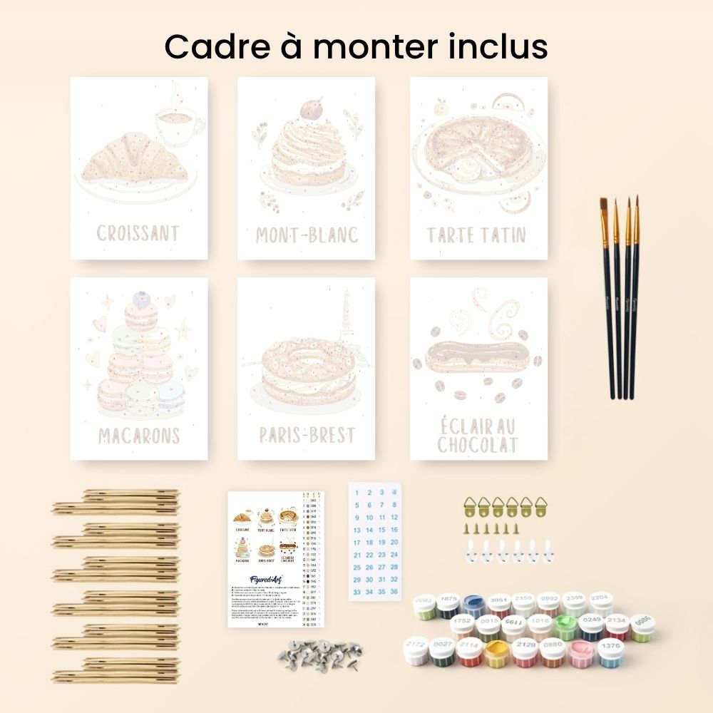Avec le set Pâtisseries Françaises de la collection Sweet Desserts, profitez d'une série de modèles délicieux de peinture par numéros inspirés par l'univers des desserts. Des pâtisseries délicates et des macarons colorés aux gâteaux élégants et friandises gourmandes, chaque création reflète la douceur, l'art et le charme de la culture pâtissière. Parfait pour apporter une touche de fantaisie et de sophistication à votre intérieur ou offrir un kit peinture à un amateur de douceurs.