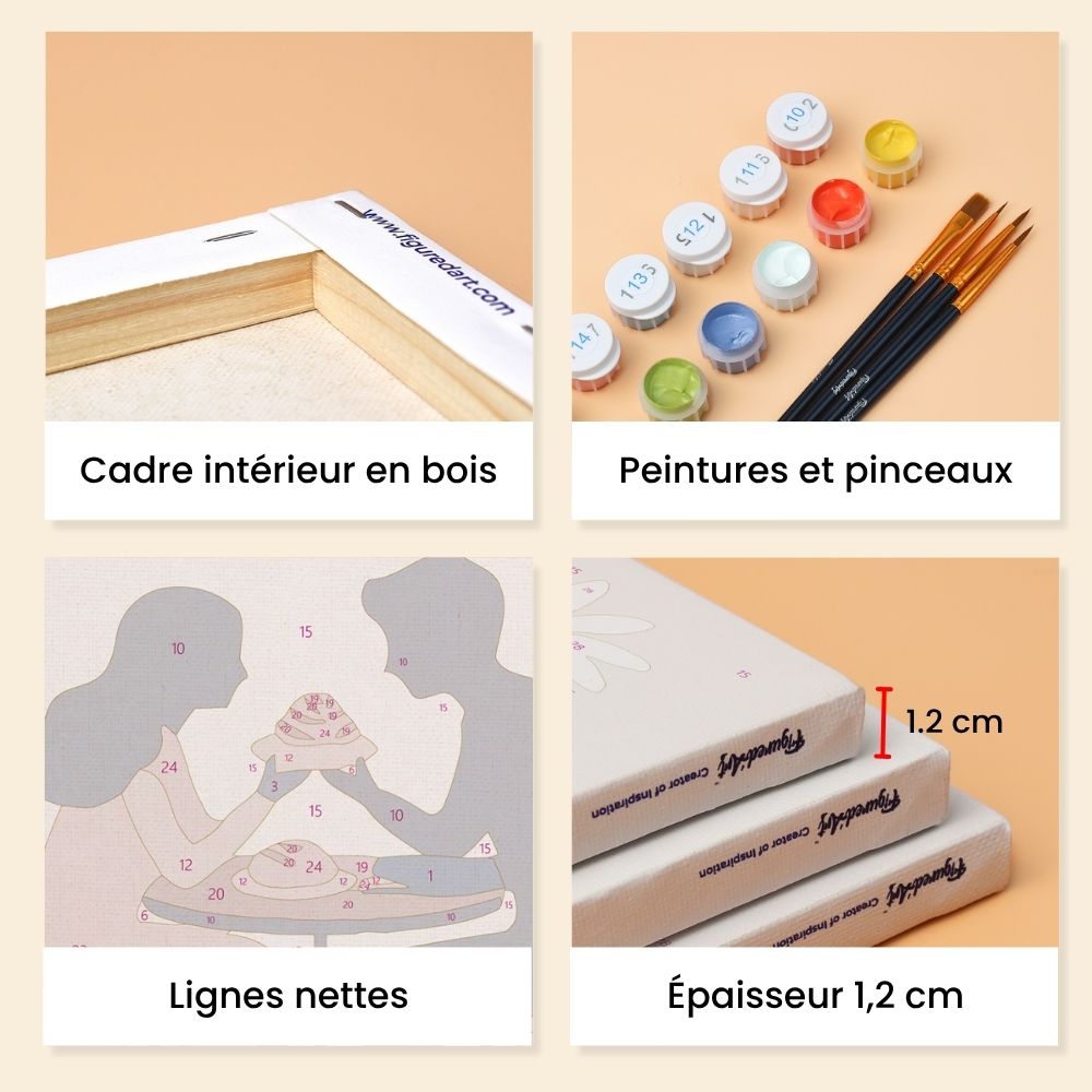 Chaque toile évoque la tendresse et la connexion, transformant des instants simples en expressions intemporelles d'affection. Un kit peinture idéal pour les esprits romantiques et les amateurs d'art délicat.