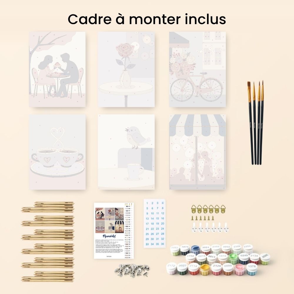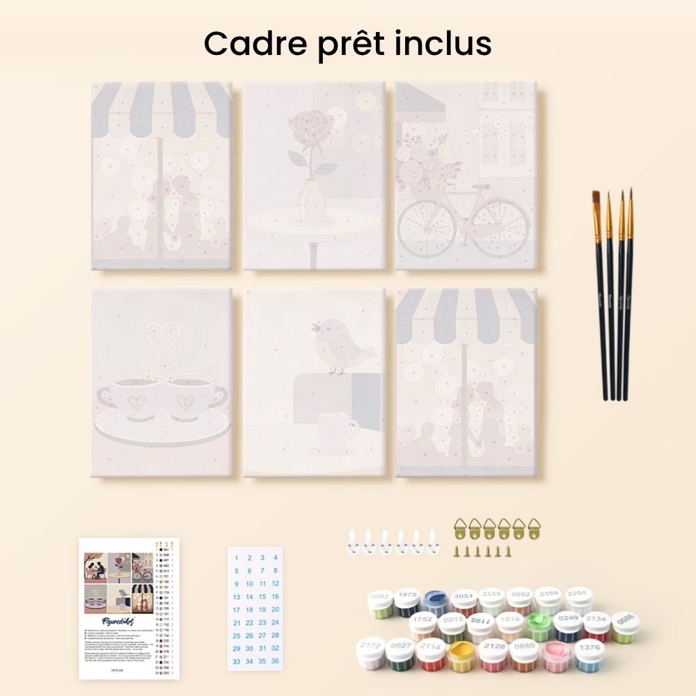 Le set Romance Café réunit six modèles de peinture par numéros qui capturent l'essence d'un rendez-vous romantique en ville. Des scènes douces de cafés partagés, de mots d'amour murmurés, de roses rouges et de promenades à vélo s'harmonisent dans une palette tendre et rêveuse.
