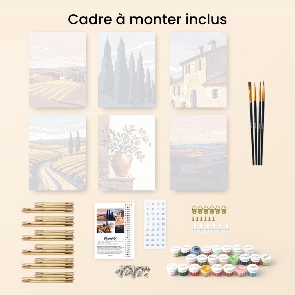 Découvrez six modèles de peinture par numéros inspirés des paysages enchanteurs de la Toscane Classique. Les vignobles vallonnés, les fermes rustiques et les oliveraies baignées de soleil sont représentés dans des tons chauds et naturels. Ces créations rendent hommage à la richesse culturelle et à la beauté de cette région italienne, parfaites pour apporter l'essence de la Toscane à votre intérieur. Un kit peinture idéal pour les amateurs d'art et de voyages.