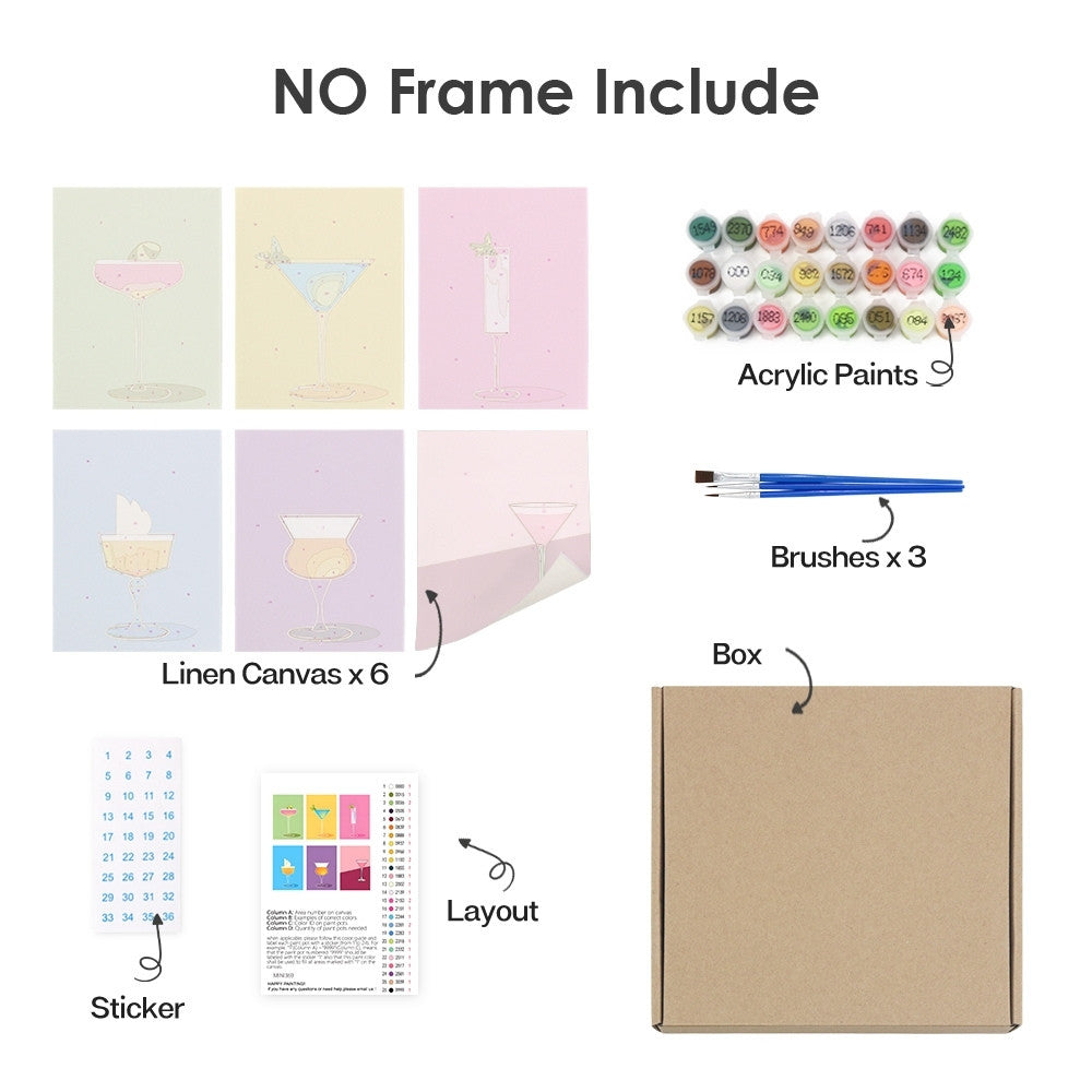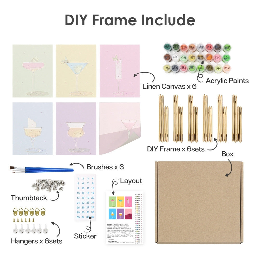 Découvrez le plaisir de peindre avec notre Peinture par numéros – Coffret de 6 toiles | Verres à Cocktail Élégants. Chaque coffret comprend six toiles à thème, des peintures acryliques pré-mélangées et tout le matériel nécessaire. Suivez le guide numéroté pour profiter d’un loisir créatif relaxant et réaliser de magnifiques tableaux à exposer ou à offrir.