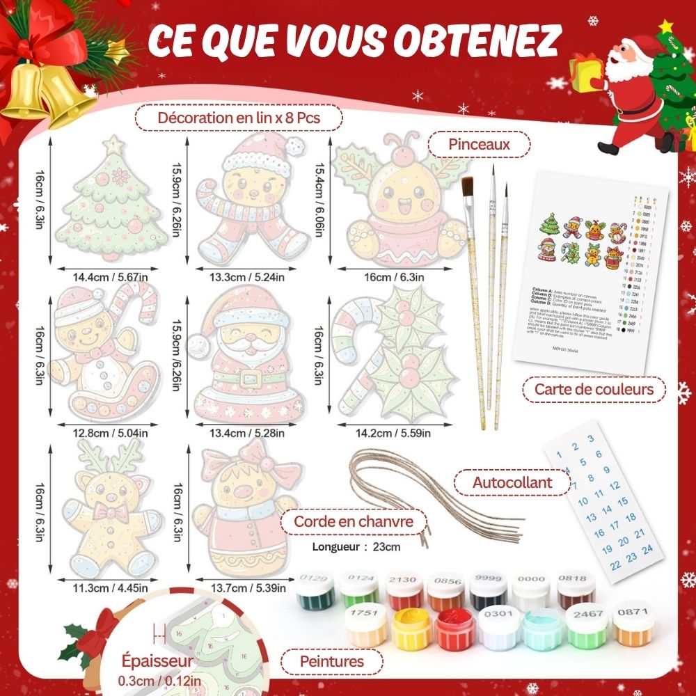 Enveloppez vos fêtes de chaleur et de créativité avec notre Décorations de Noël Peinture par Numéros. Ces magnifiques décorations évoquent la douce chaleur d'un après-midi d'hiver, parfumée aux biscuits et à la cannelle. Chaque pièce en bois reprend la forme des décorations de Noël classiques : bonshommes en pain d'épice, maisons, étoiles et bien d'autres, prêtes à être peintes aux couleurs chaudes des fêtes. Une façon amusante et créative de décorer votre sapin avec votre touche personnelle. Chaque pièce capture la magie de Noël et le confort de l'hiver, apportant une touche spéciale à votre décoration. Suivez simplement les numéros et admirez vos décorations prendre vie, colorées et charmantes.