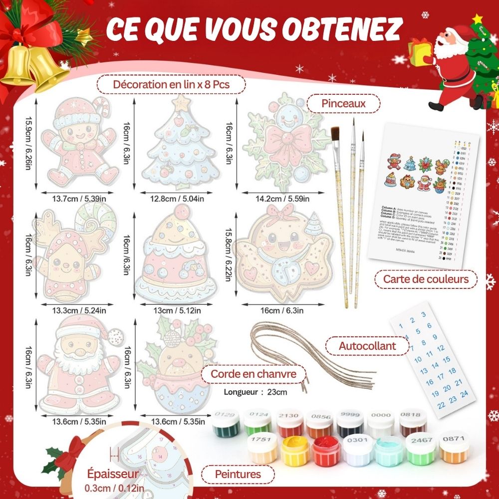 Enveloppez vos fêtes de chaleur et de créativité avec notre Décorations de Noël Peinture par Numéros. Ces magnifiques décorations évoquent la douce chaleur d'un après-midi d'hiver, parfumée aux biscuits et à la cannelle. Chaque pièce en bois reprend la forme des décorations de Noël classiques : bonshommes en pain d'épice, maisons, étoiles et bien d'autres, prêtes à être peintes aux couleurs chaudes des fêtes. Une façon amusante et créative de décorer votre sapin avec votre touche personnelle. Chaque pièce capture la magie de Noël et le confort de l'hiver, apportant une touche spéciale à votre décoration. Suivez simplement les numéros et admirez vos décorations prendre vie, colorées et charmantes.