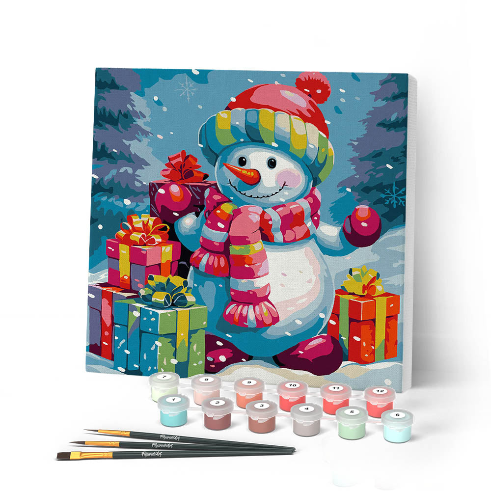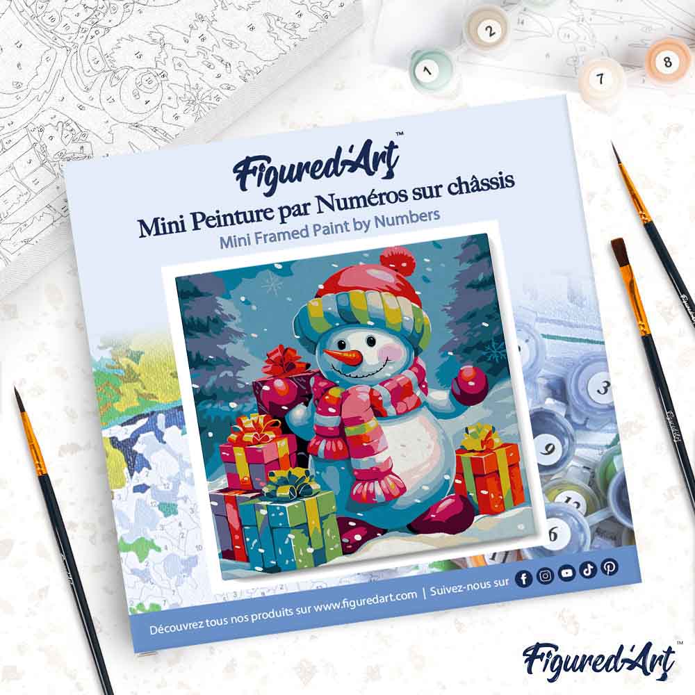 Modèle : Mini Peinture par Numéros 20x20cm avec cadre Bonhomme de Neige et Cadeaux dans la Neige