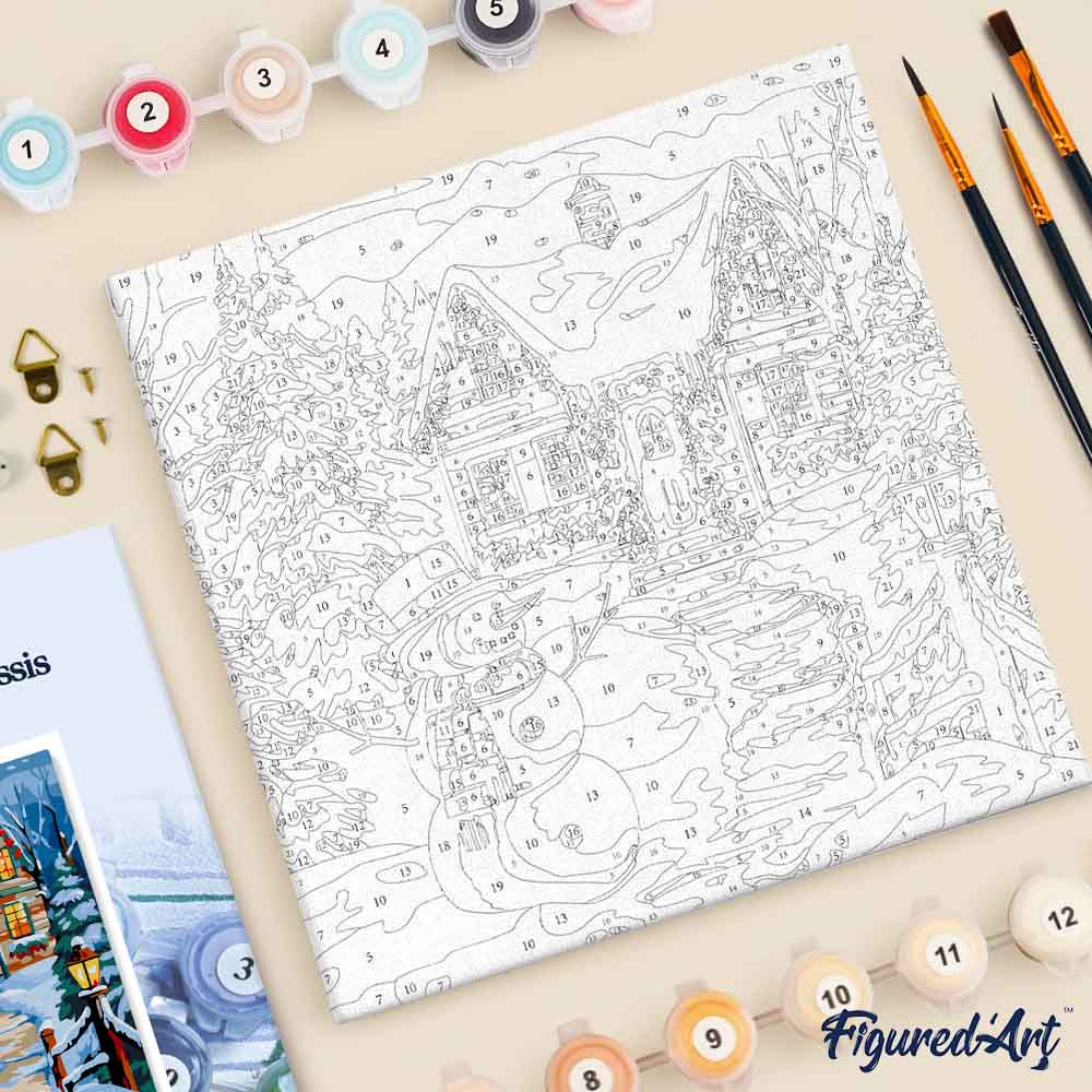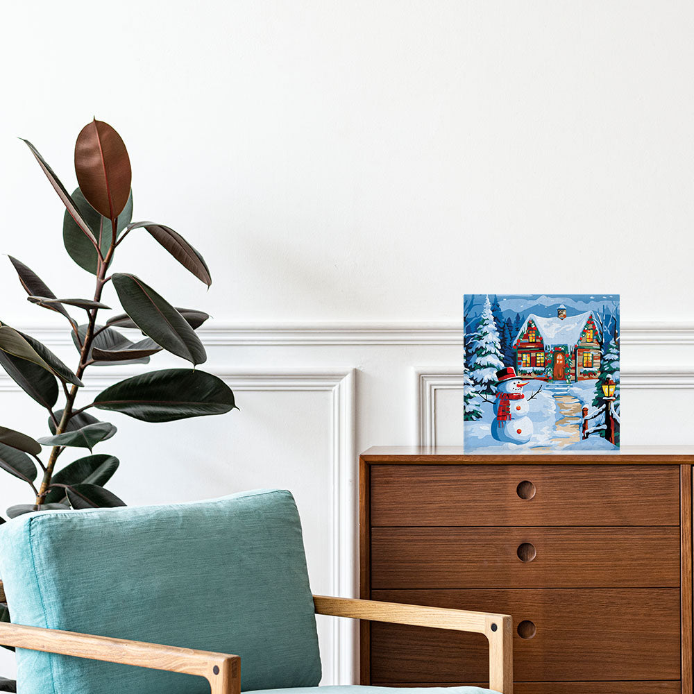 Mini Peinture par Numéros 20x20cm avec cadre Bonhomme de Neige et Chaumière