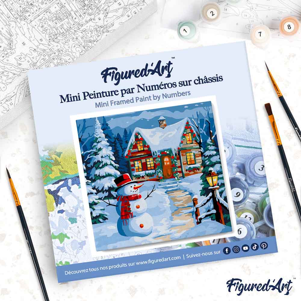 Modèle : Mini Peinture par Numéros 20x20cm avec cadre Bonhomme de Neige et Chaumière