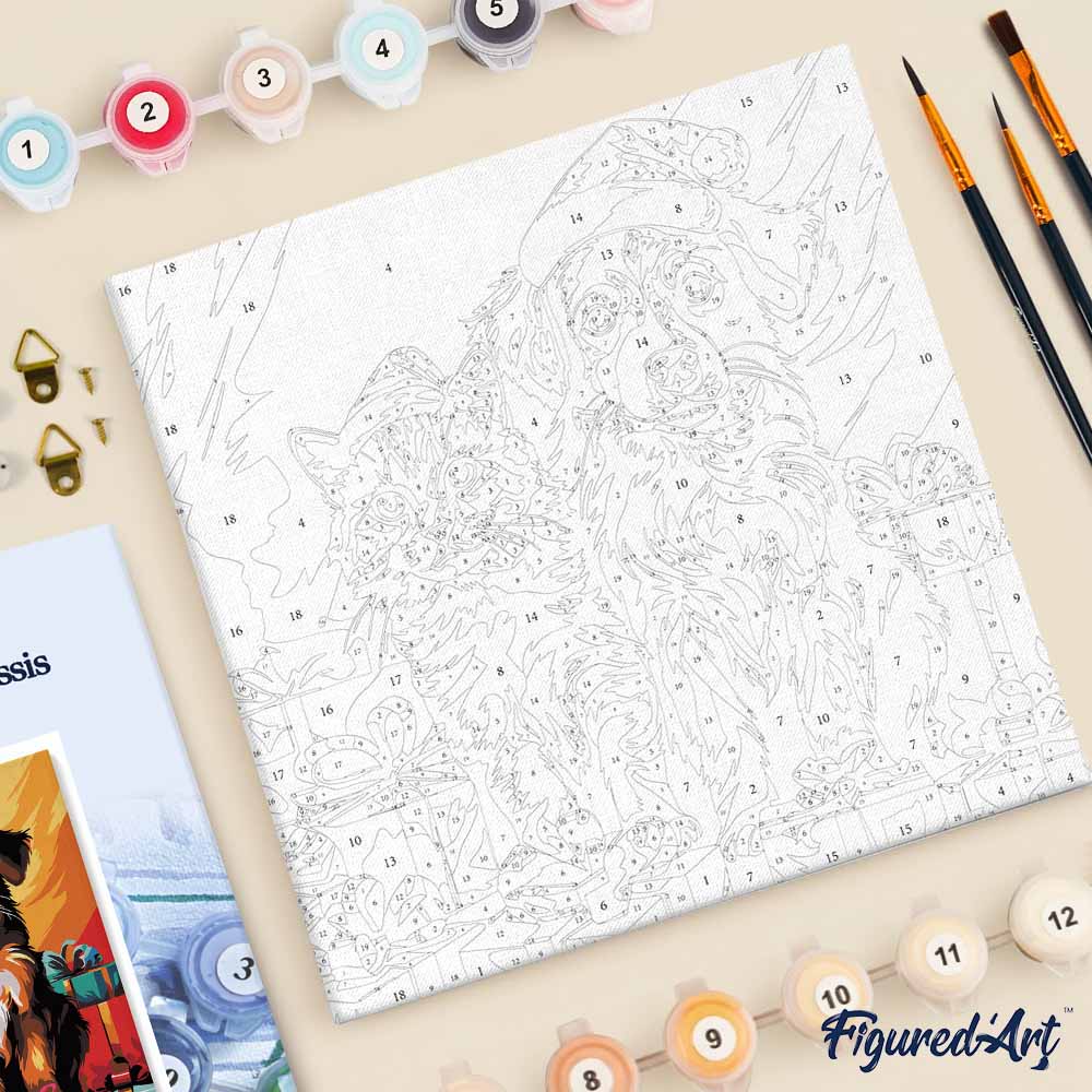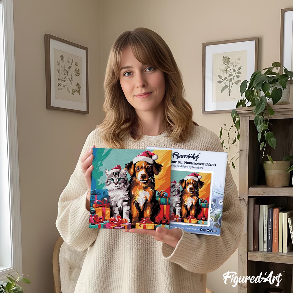Modèle : Mini Peinture par Numéros 20x20cm avec cadre Chat et Chien Festifs