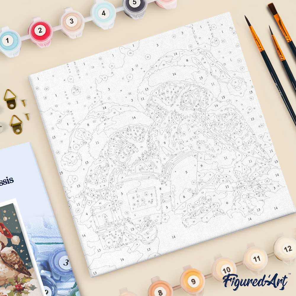 Modèle : Mini Peinture par Numéros 20x20cm avec cadre Chouettes Père Noël Lisant