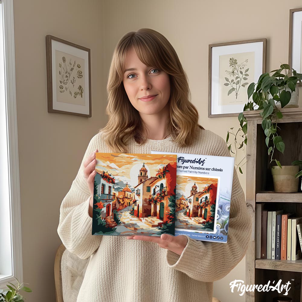 Modèle : Mini Peinture par Numéros 20x20cm avec cadre Église de Village Ensoleillé