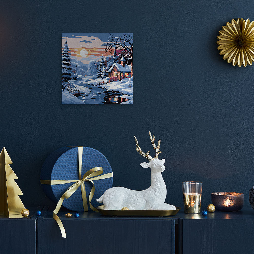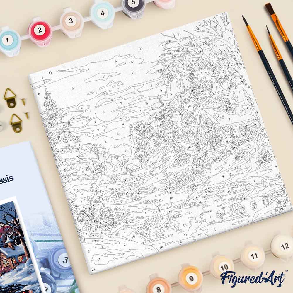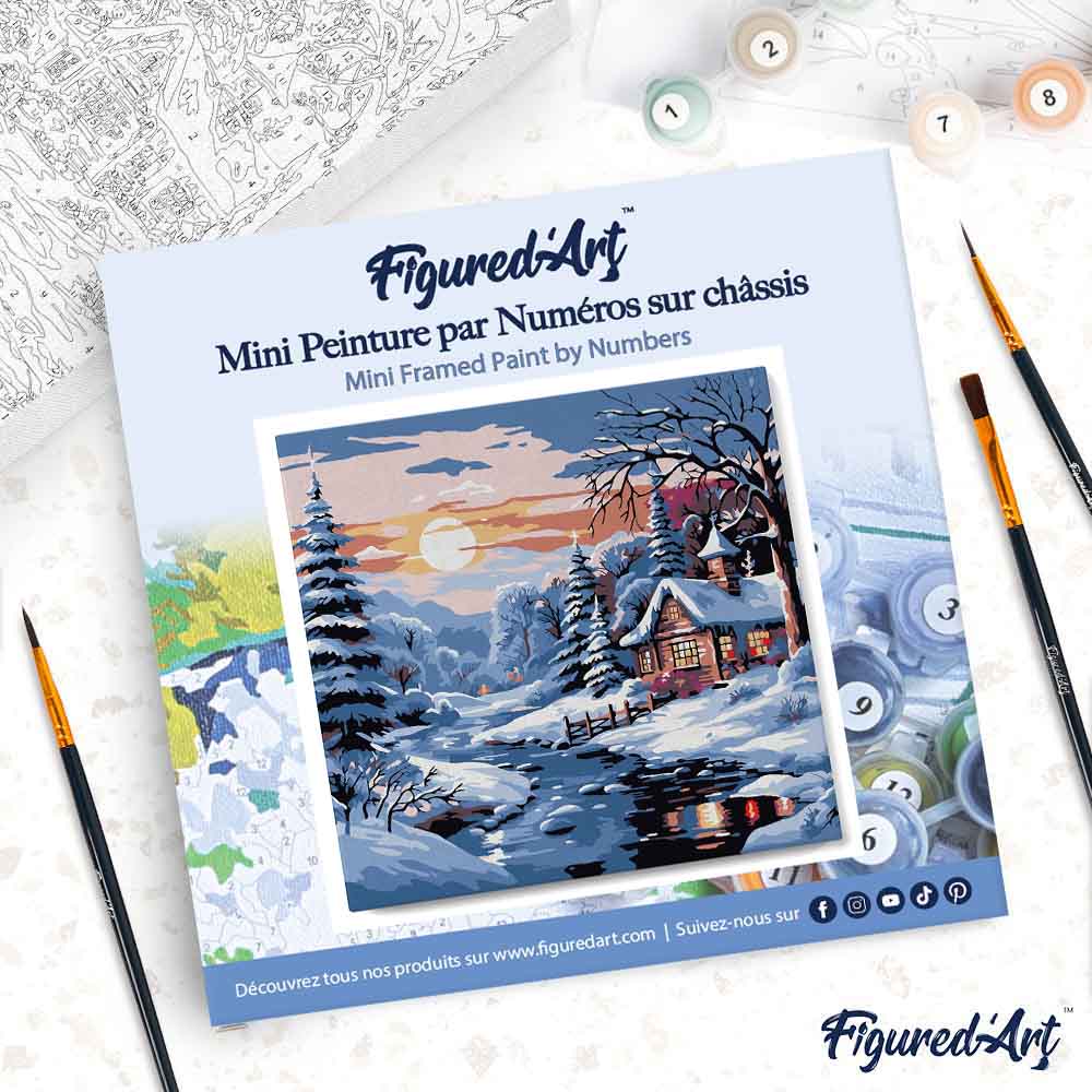 Modèle : Mini Peinture par Numéros 20x20cm avec cadre Jolie Chaumière sous la Neige