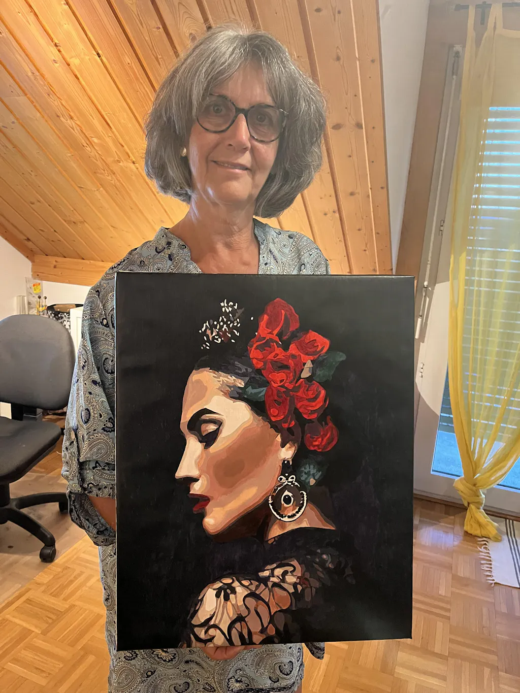 J'ai beaucoup aimé peindre ce tableau. Et il a bien du succès autour de moi également. J'ai un peu estompé les couleurs de la pommette et vais certainement faire encore de même au niveau de la tempe. Merci pour ce beau modèle!