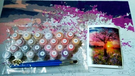 2) Vous recevrez un kit prêt à utiliser qui contient la toile avec les zones numérotées, les pots de peintures eux aussi numérotés, les pinceaux ainsi qu'une photo du résultat attendu pour vous guider. C'est parti !