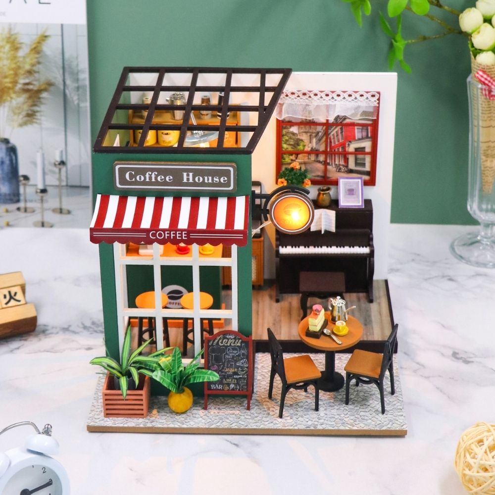La Maison Miniature Café de l'Après-midi capture le charme d'un café chaleureux, où chaque détail crée un espace accueillant pour la détente et le plaisir. De l'auvent rayé du café et du menu sur tableau noir à la lueur chaleureuse à l'intérieur, cette scène miniature vous transporte instantanément dans un après-midi paisible. L'intérieur présente un piano poli, une machine à café, des théières, des gâteaux et des étagères pleines de friandises—offrant un moment de conte de fées figé dans le temps.