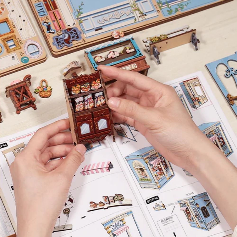 En ouvrant le coffret, vous découvrirez tout le nécessaire pour construire une maison miniature en toute simplicité : pièces finement découpées, petites décorations à assembler, ainsi que des touches de couleur et de texture qui vous guideront dans la création d'un univers cohérent. Ce processus minutieux, mais accessible, transforme une activité créative en un moment de calme, presque méditatif, où l'on voit peu à peu naître un petit monde sous ses doigts.
