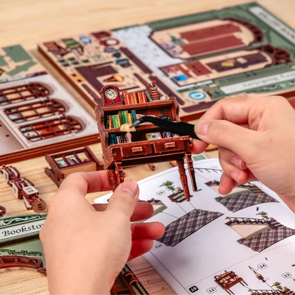 En ouvrant le coffret, vous découvrirez tout le nécessaire pour construire une maison miniature en toute simplicité : pièces finement découpées, petites décorations à assembler, ainsi que des touches de couleur et de texture qui vous guideront dans la création d'un univers cohérent. Ce processus minutieux, mais accessible, transforme une activité créative en un moment de calme, presque méditatif, où l'on voit peu à peu naître un petit monde sous ses doigts.