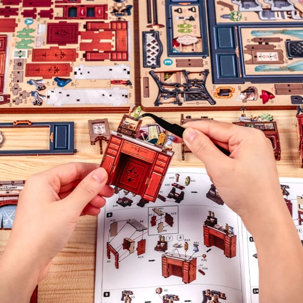 En ouvrant le coffret, vous découvrirez tout le nécessaire pour construire une maison miniature en toute simplicité : pièces finement découpées, petites décorations à assembler, ainsi que des touches de couleur et de texture qui vous guideront dans la création d'un univers cohérent. Ce processus minutieux, mais accessible, transforme une activité créative en un moment de calme, presque méditatif, où l'on voit peu à peu naître un petit monde sous ses doigts.