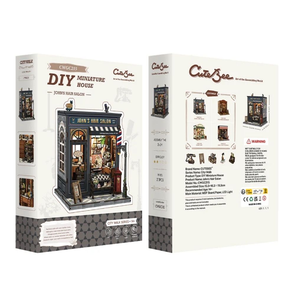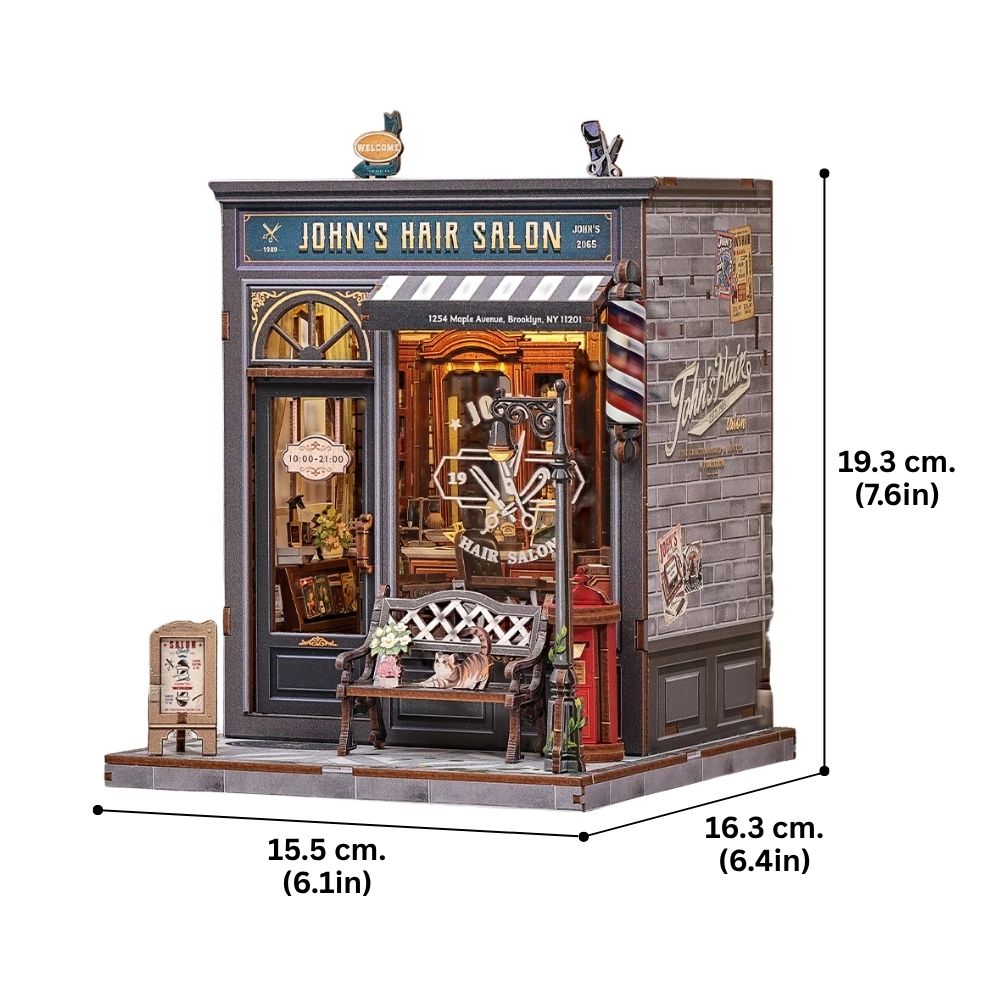 Le Salon de John capture le charme d'un salon de coiffure américain classique en miniature. Les murs en briques rouges, les fauteuils en cuir vintage, la boîte aux lettres ancienne et même un petit chat près de la porte recréent l'ambiance chaleureuse d'un coin de quartier. Avec ce kit vous pouvez construire une maison miniature transformée en diorama vivant et accueillant, idéal pour décorer votre espace avec nostalgie et caractère.