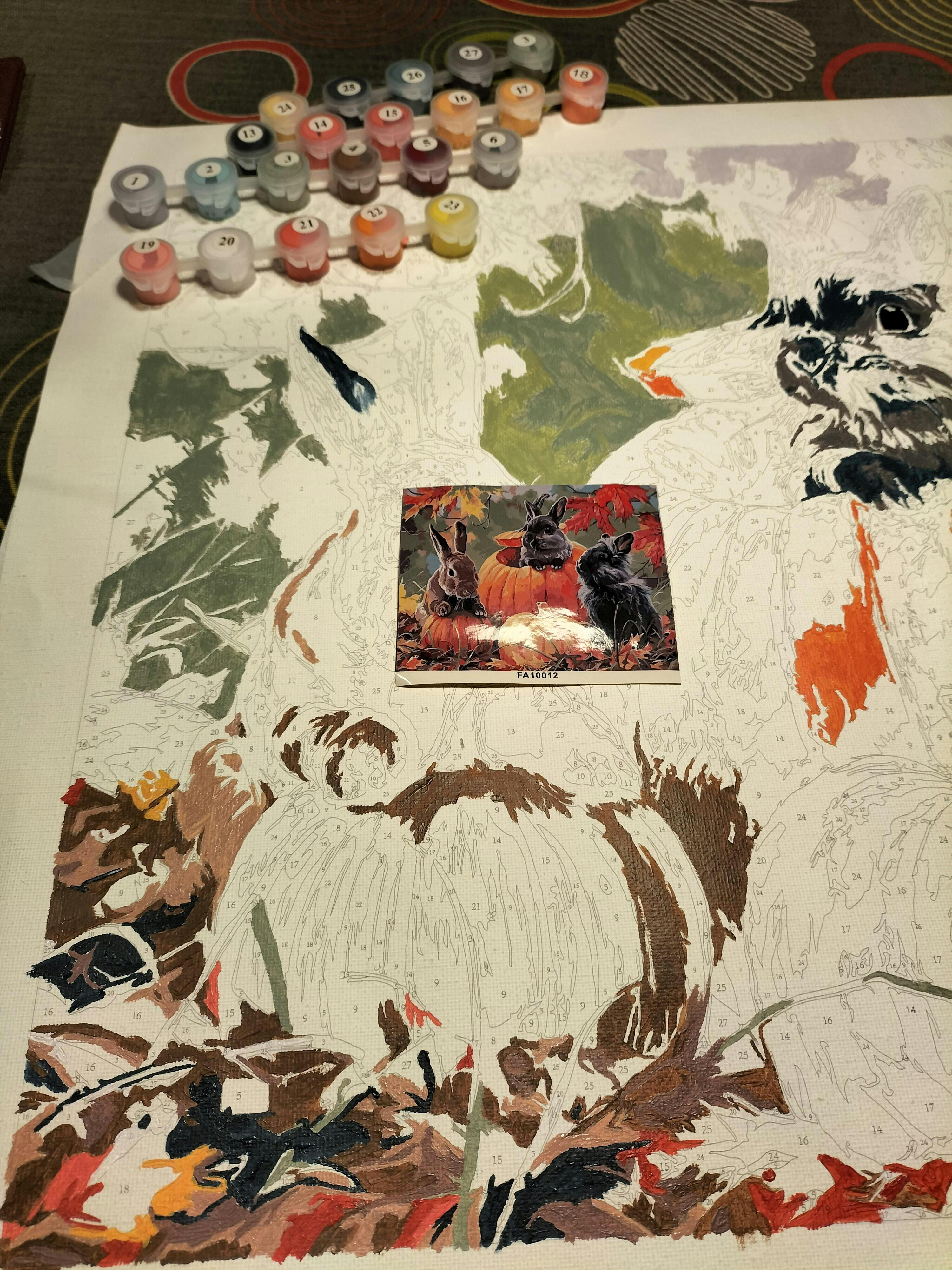 J'ai adoré se trio de lapin avec les couleurs de l'automne, ainsi les citrouilles qui forme un tableau apaisant. Merci.