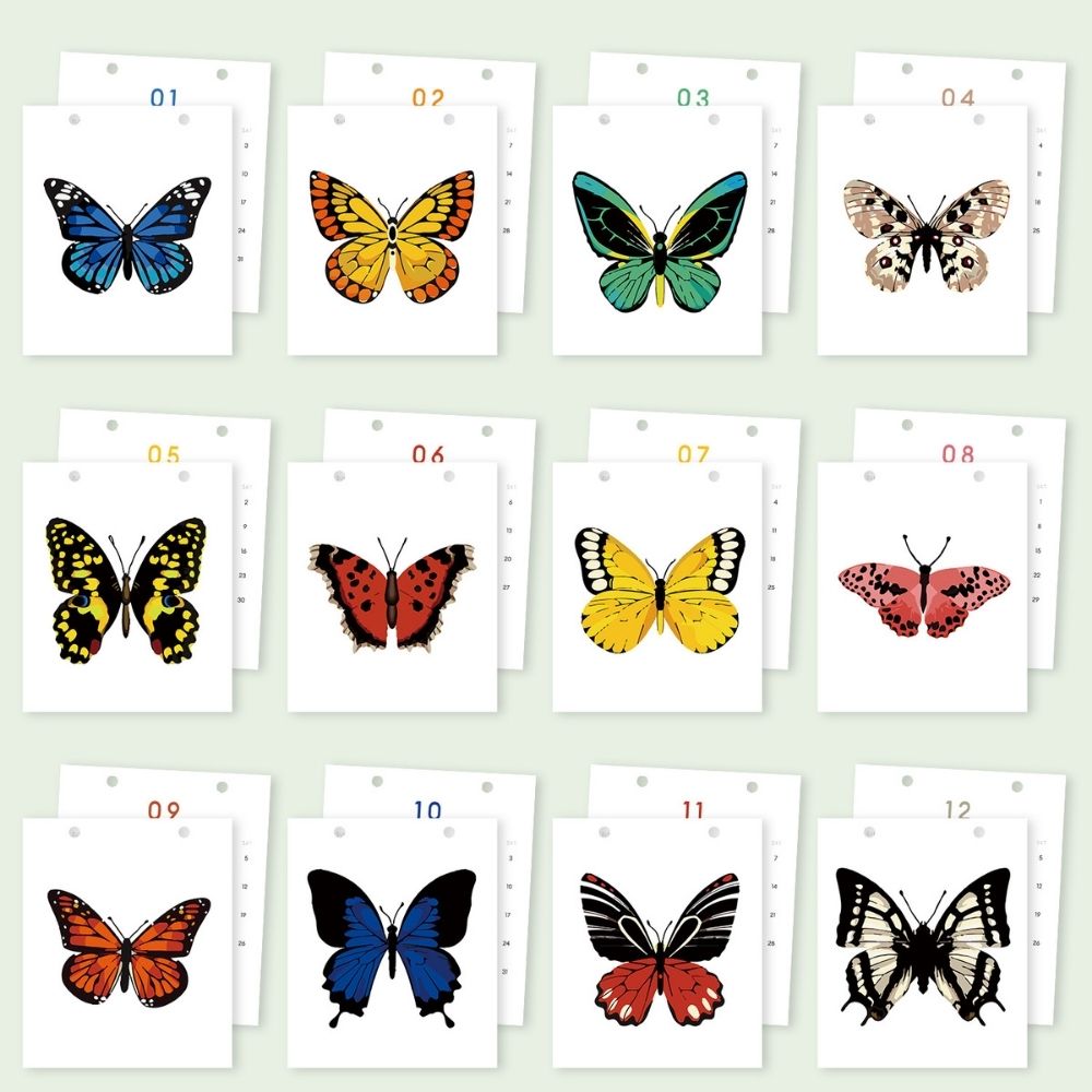• 12 Designs de Papillons : Une illustration de papillon dessinée à la main différente pour chaque mois.