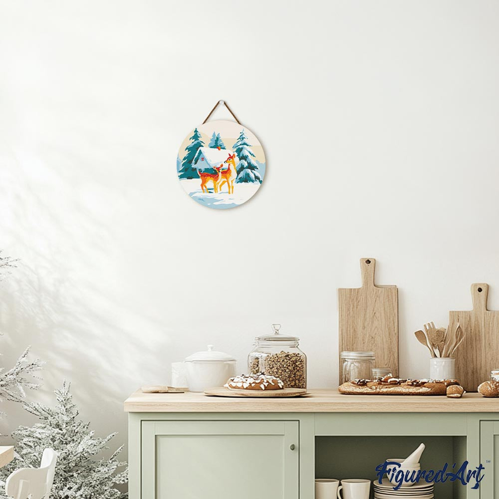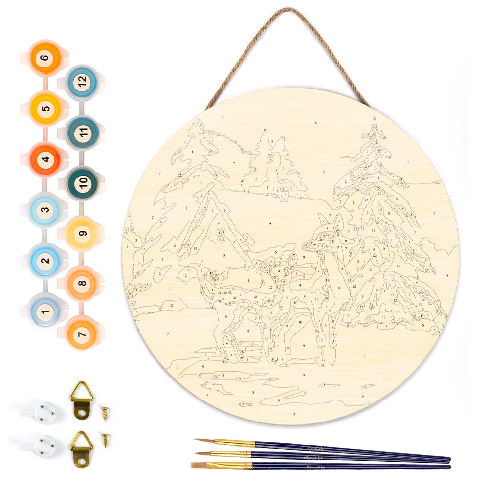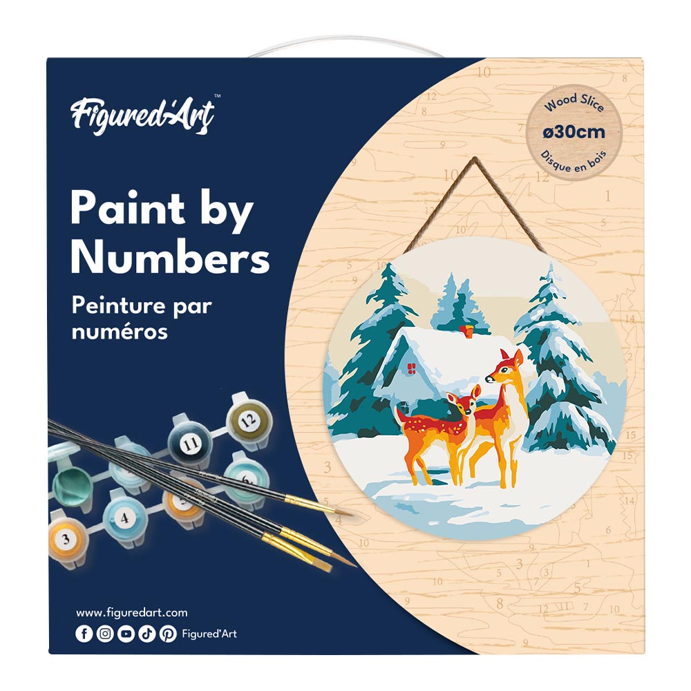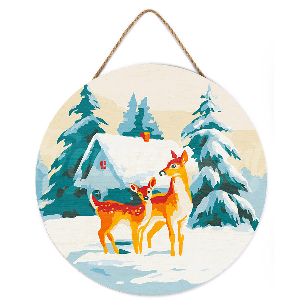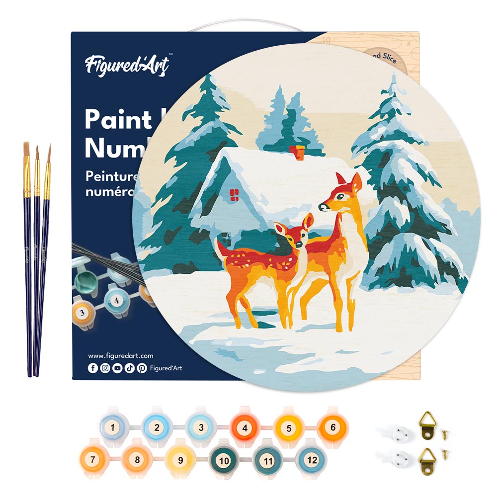 Modèle : Peinture par Numéro sur Disque en Bois - Biches et Cabane