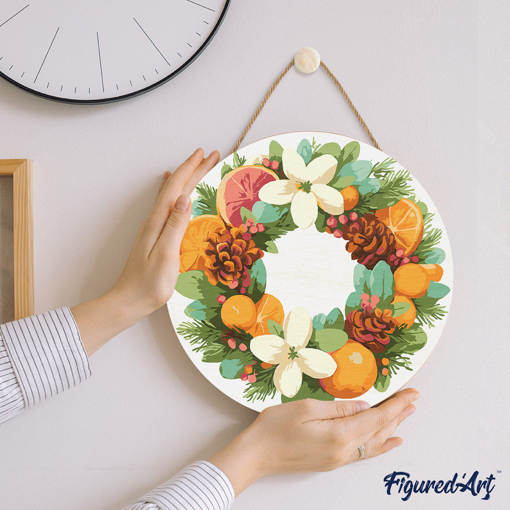 Modèle : Peinture par Numéro sur Disque en Bois - Couronne d’Agrumes et de Pin