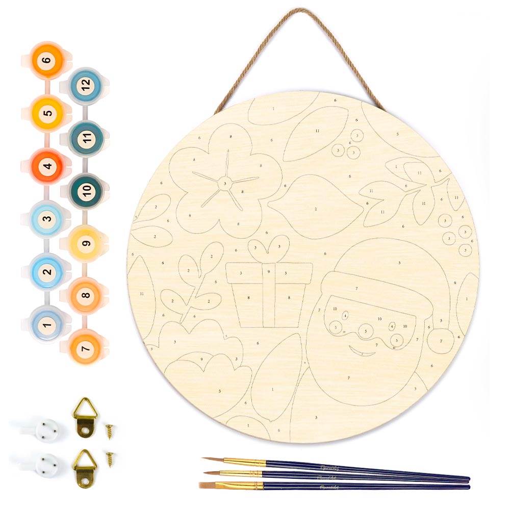 Disque en bois numéroté : Un disque de bois de 30cm de diamètre, pré-numéroté pour faciliter la peinture, avec une corde de suspension murale pour un affichage facile.