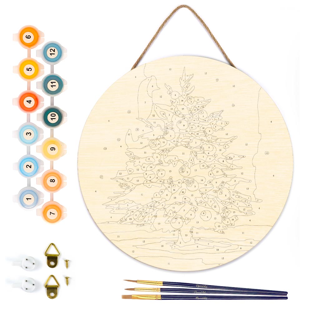 Modèle : Peinture par Numéro sur Disque en Bois - Sapin de Noël Enneigé