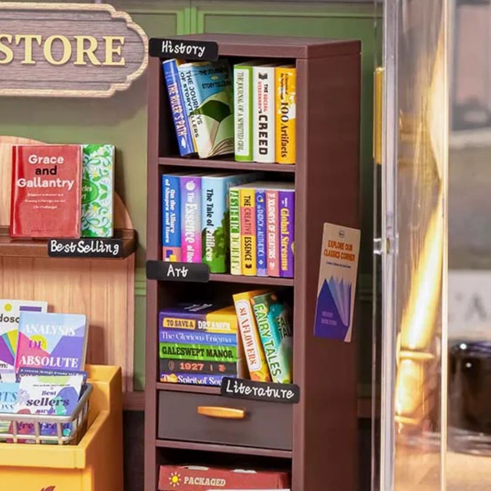 Remontez le temps avec la Librairie Mémoire, un havre miniature célébrant le charme et l'art des librairies classiques. Les étagères débordent de livres d'art et d'encyclopédies. Des couvertures et illustrations soigneusement conçues, associées à des étagères en bois harmonieusement agencées, donnent vie à cet espace en rendant hommage à la littérature et à l'art d'avant l'ère numérique. Parfaite pour les amateurs de DIY, cette boutique miniature capture la chaleur, l'intellect et l'attrait intemporel d'un lieu où les histoires et le savoir sont précieux, offrant une pièce décorative à la fois nostalgique et captivante.
