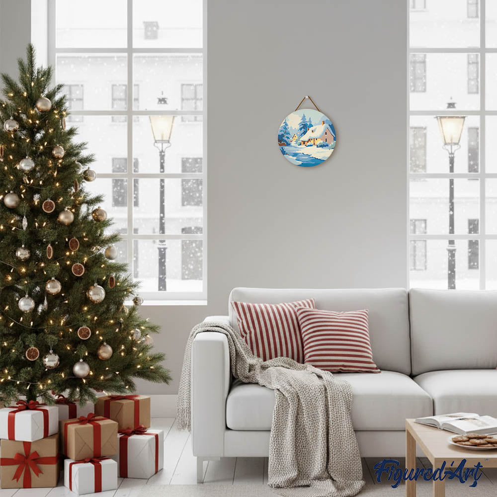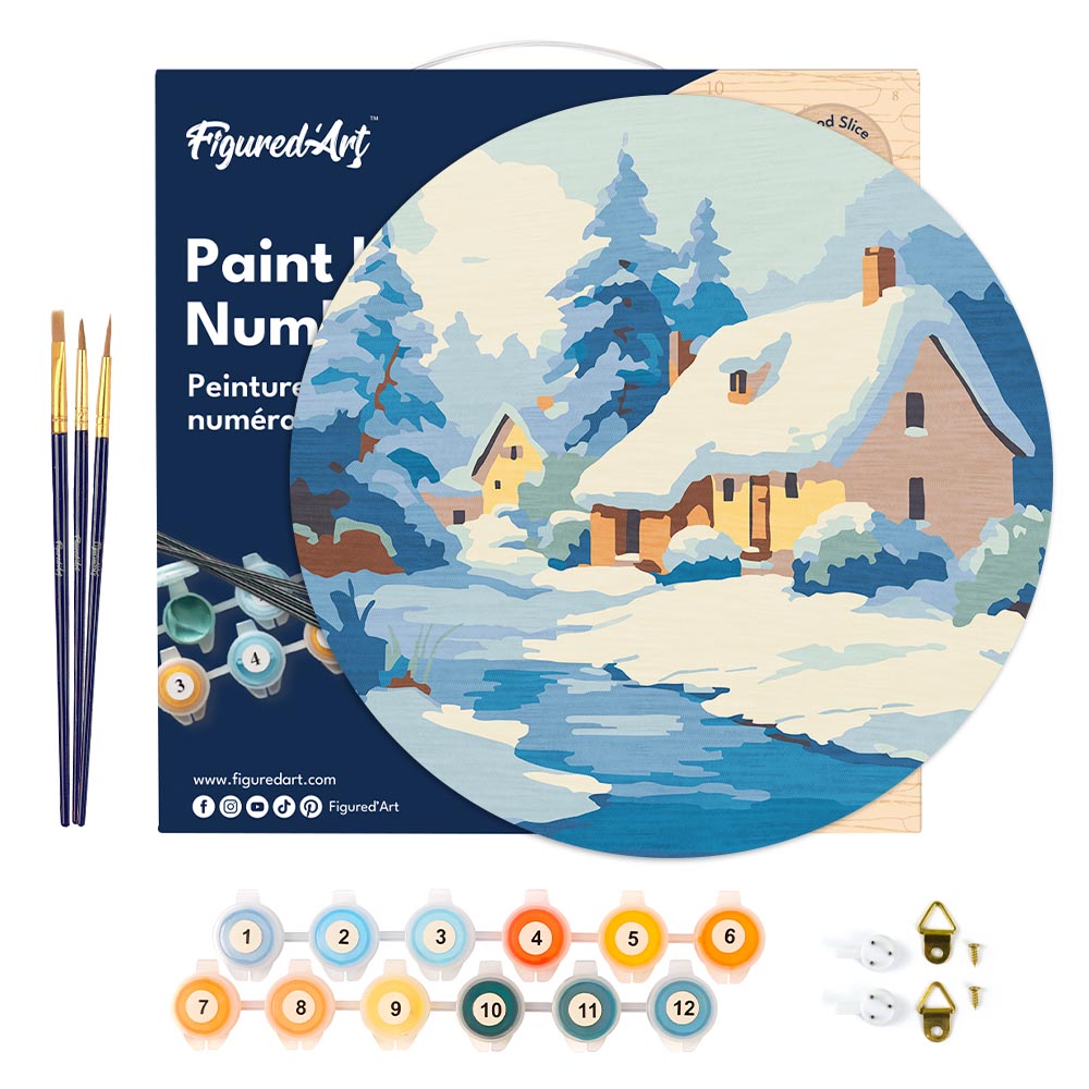 Modèle : Peinture par Numéro sur Disque en Bois - Chalet en Hiver