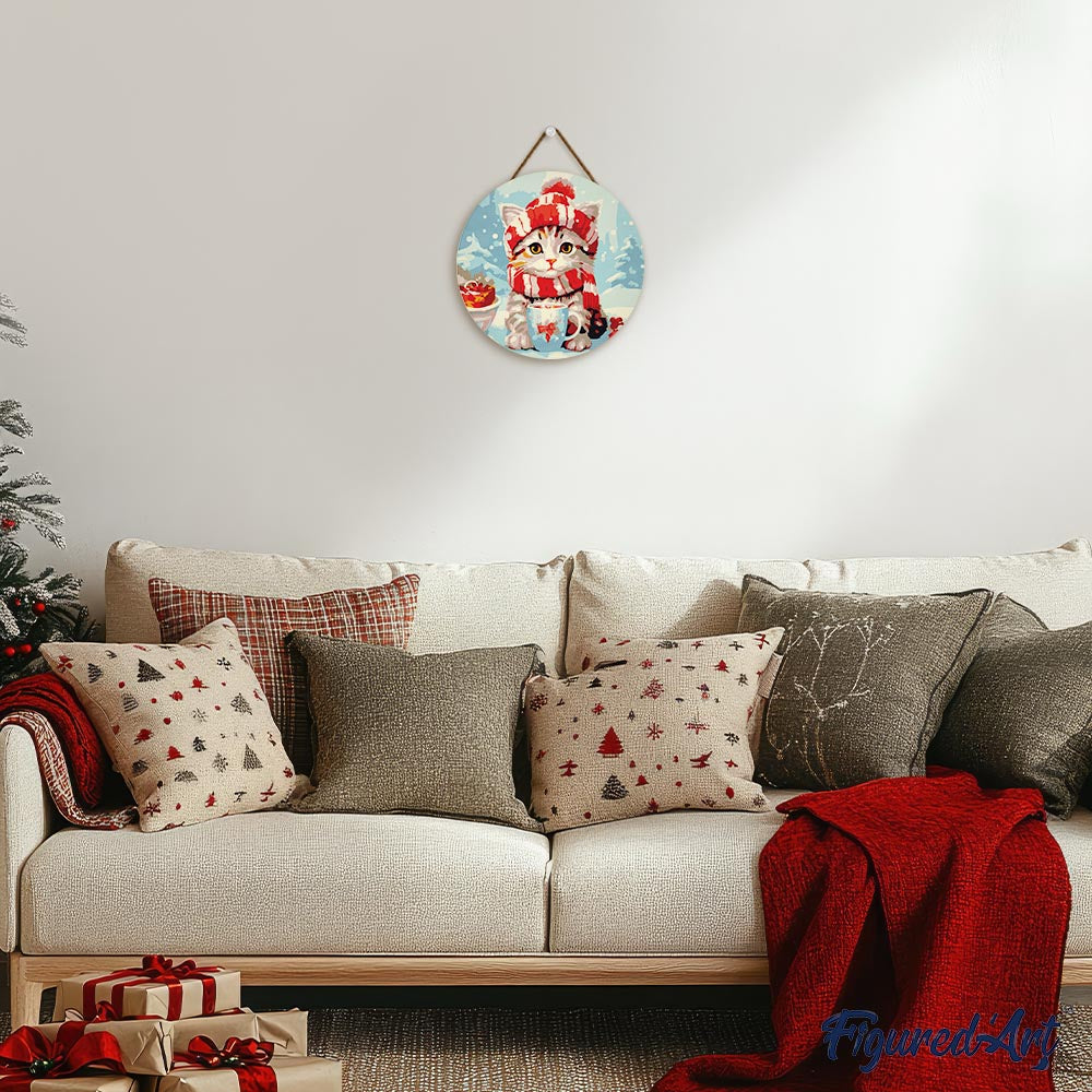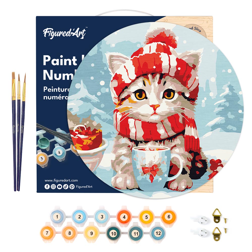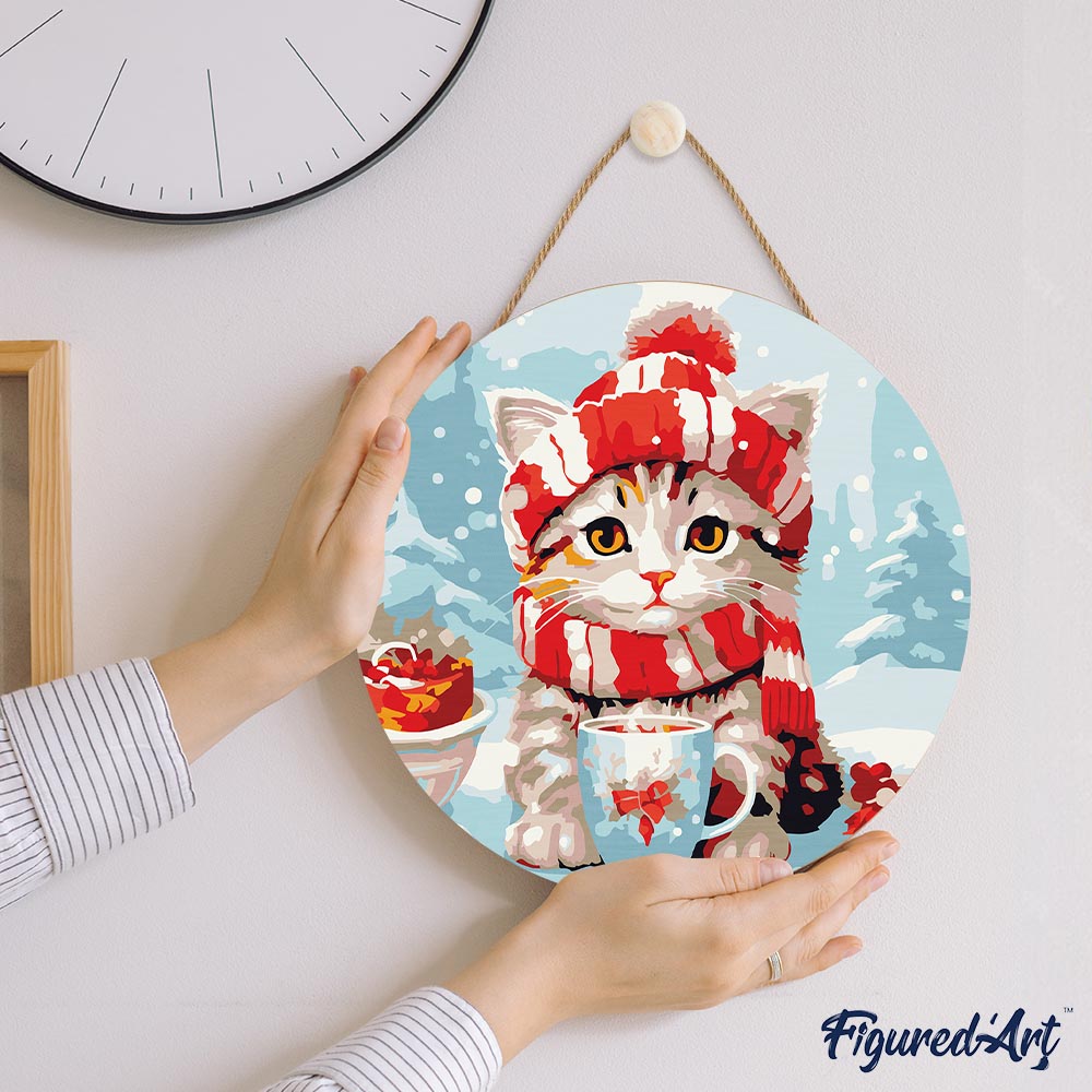 Modèle : Peinture par Numéro sur Disque en Bois - Chat Mignon avec Écharpe Rouge