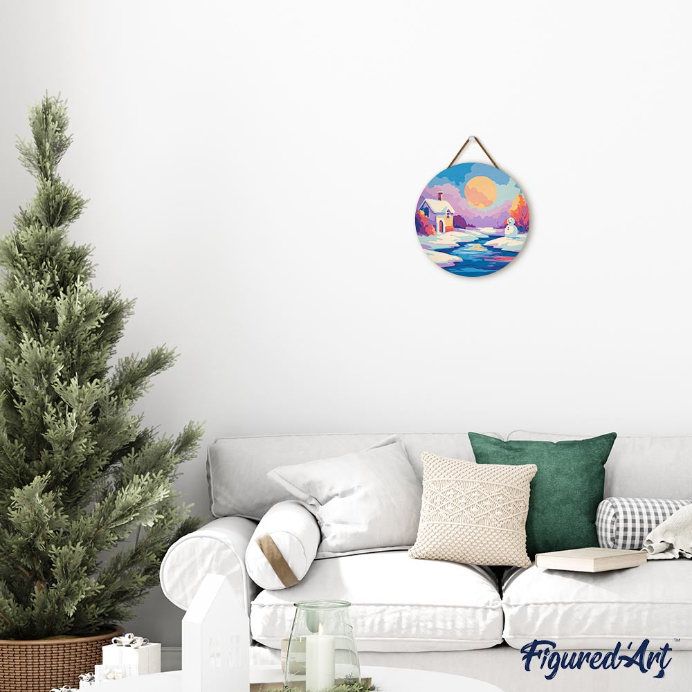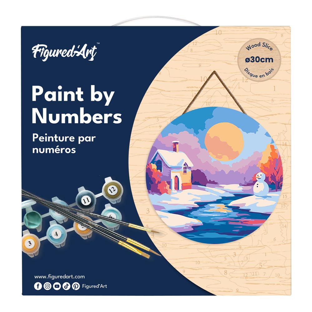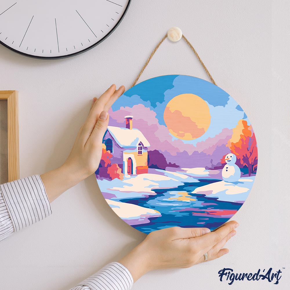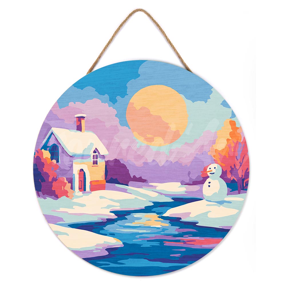 Modèle : Peinture par Numéro sur Disque en Bois - Scène Hivernale au Coucher du Soleil
