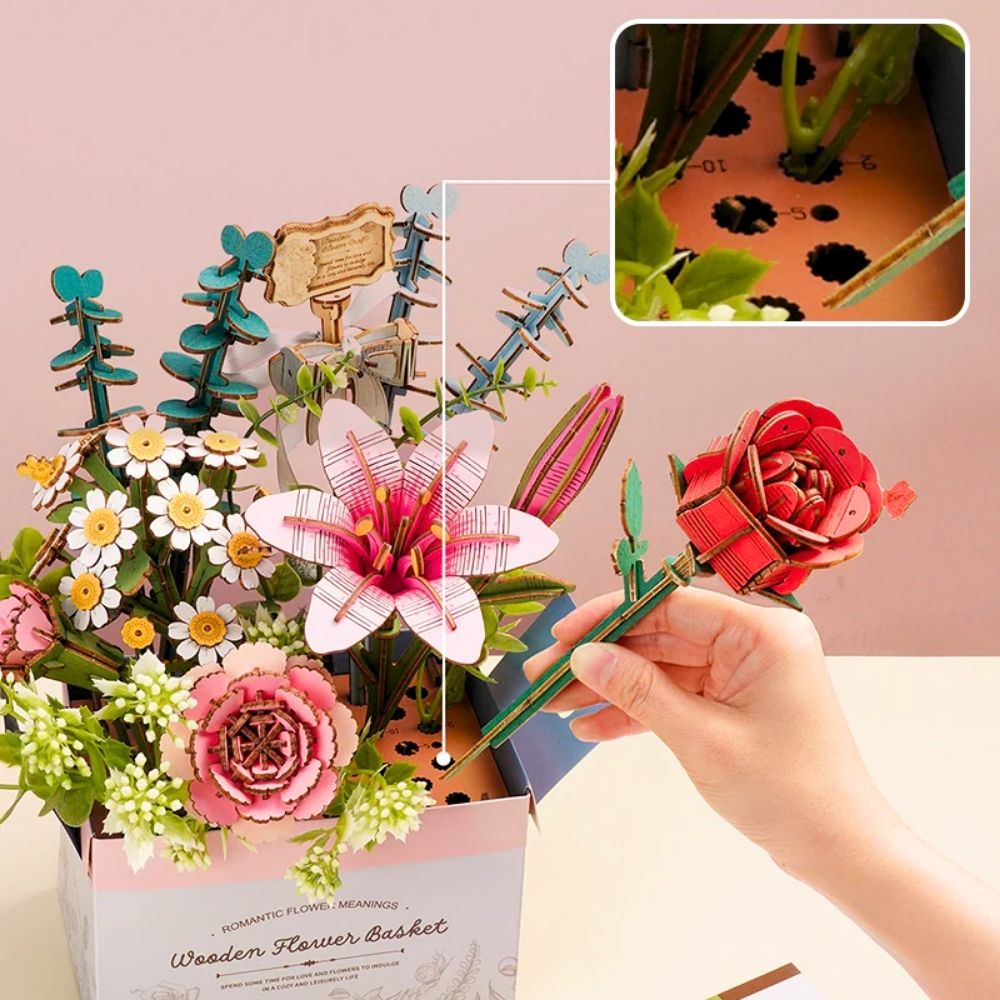 Le Panier de Fleurs en Bois est à la fois un kit créatif amusant et un cadeau attentionné pour les anniversaires, fêtes ou occasions spéciales. Une fois terminé, il sert de décoration élégante pour votre salon, chambre ou bureau, ajoutant une touche de beauté naturelle à votre maison.
